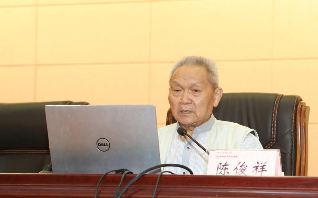 86岁的陈俊祥老人曾参与过我国原子弹、氢弹科研工作。回忆起研制核武器的艰难研制历程,陈俊祥感叹道,“那时候真的恼火。”他讲道,上世纪50年代,面对核大国的威胁,中国下定决心研制自己的“两弹”,1958年,中物院在北京成立;1963年大部队迁移到青海金银滩草原,先后成功爆炸我国第一颗原子弹、氢弹;1969年,中物院迁至川北深山902地区,上万名科技工作者在四川继续踏上核武器研究之路……“在当年物质物资匮乏的年代,科研人员难,国家也难”,陈俊祥老人至今还清楚记得科学家们星期天赶场买鸡蛋,路上跑15公里;突发疾病缺医少药,颠簸50公里才到医院;山沟里缺老师,下一代的教育令人发愁等种种往事。“但是,领导国防工业和科研工作的老一辈无产阶级革命家还是始终保持坚定的态度,1964年10月16日,我国第一颗原子弹爆炸成功。有的国家认为我们20年搞不出来的原子弹,我们4年就搞出来了。”陈俊祥自豪地提高了音量。通过讲述我国核事业难忘的发展历程和两弹元勋的感人事迹,陈老生动阐述了“热爱祖国、无私奉献,自力更生、艰苦奋斗,大力协同、勇于登攀”的“两弹一星”精神内涵。观众中爆发出阵阵热烈掌声,无不被陈老及所有核工作者对祖国深沉的爱、科研报国初心及为中国核事业奋斗终身的豪情壮志所感动。