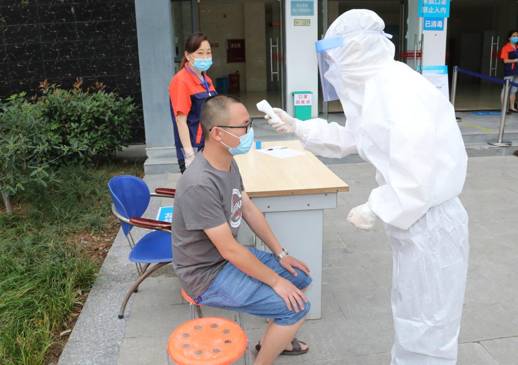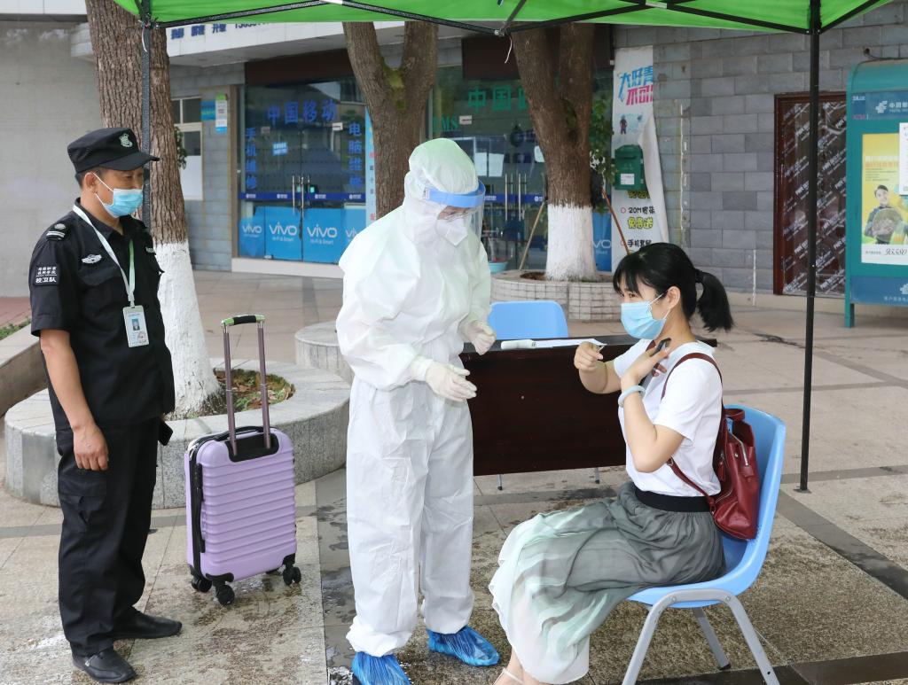 上午9时,各项演练有序推进。在学生返校演练场景中,学生出示健康码入校,有序排队,按规定保持间隔距离。疫情检测组工作人员逐一检测学生体温,发现有学生体温异常时,工作人员立即引导其前往临时留观点等候,确认体温异常时,启动应急处置。