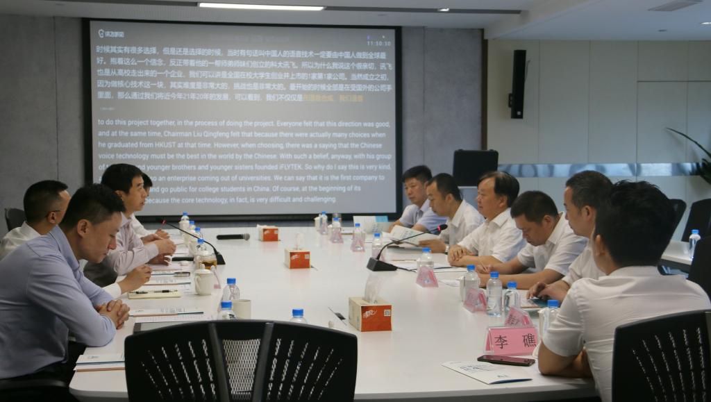 签约仪式前,李剑峰陪同何礼果一行参观了科大讯飞公司展厅和办公区域,介绍了公司的发展历程、最新技术进展及讯飞在AI教育、AI医疗、AI政法、AI服务等方面的应用场景及产业布局。