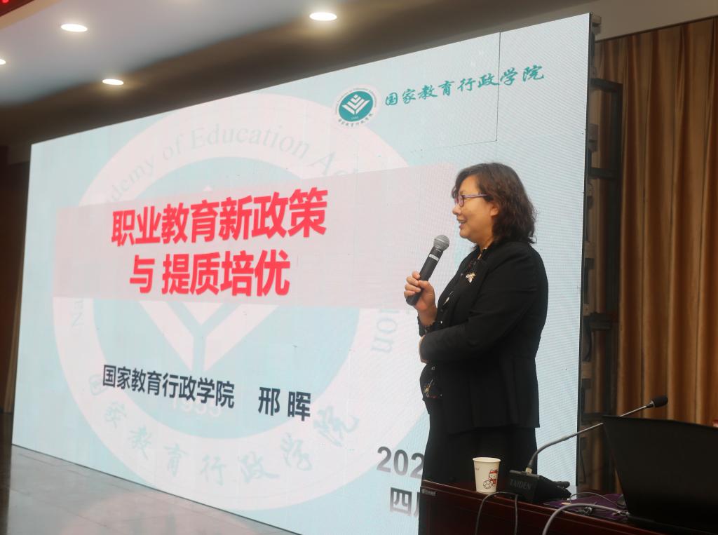 会上,邢晖作《职业教育新政策与提质培优》《职业教育提质培优的关键要素》专题学术报告。她说, 4月12日至13日,全国职业教育大会表明在全面建设社会主义现代化国家新征程中,职业教育前途广阔,大有可为。从职业教育在“十三五"中取得的成就可以看出,我国的职业教育规模越来越大,政策越来越好,体系更加健全,前景更加广阔。九部门联合发布的《职业教育提质培优行动计划》( 2020-2023年) ,其目标是让职业教育与经济社会发展需求对接更加紧密、同人民群众期待更加契合、同我国综合国力和国际地位更加匹配,中国特色现代职业教育体系更加完备、制度更加健全、标准更加完善、条件更加充足、评价更加科学,而提质培优就是要提高职业教育质量,培育职业教育品牌,从而增加成长成才价值,提高吸引力,赋予经济发展动能。