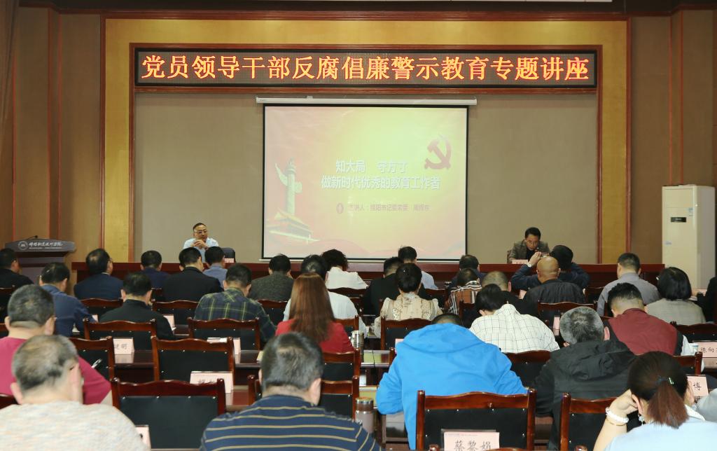 为庆祝建党100周年,深入推进党史学习教育,加强全面从严治党,提高拒腐防变能力,增强党员领导干部政治意识、法律意识、规矩意识,4月30日,学校举办党员领导干部反腐倡廉警示教育专题讲座,特邀绵阳市纪委常委周捍东作题为《知大局守方寸 做新时代优秀的教育工作者》的专题讲座。全校科级以上干部、各党总支(直属党支部)纪检委员参会。学校党委常委、纪委书记沈利剑主持专题讲座。