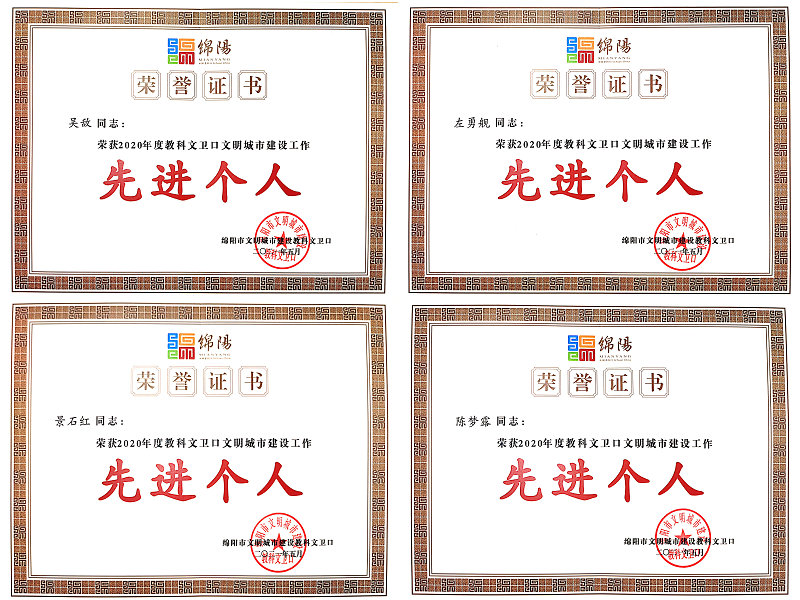 近日,绵阳市文明城市建设教科文卫口对全市教科文卫口在文明城市建设工作中涌现出的先进个人进行了表彰,我校教师吴敌、左勇舰、景石红、陈梦露荣获“2020年度建设全国文明城市先进个人”称号。