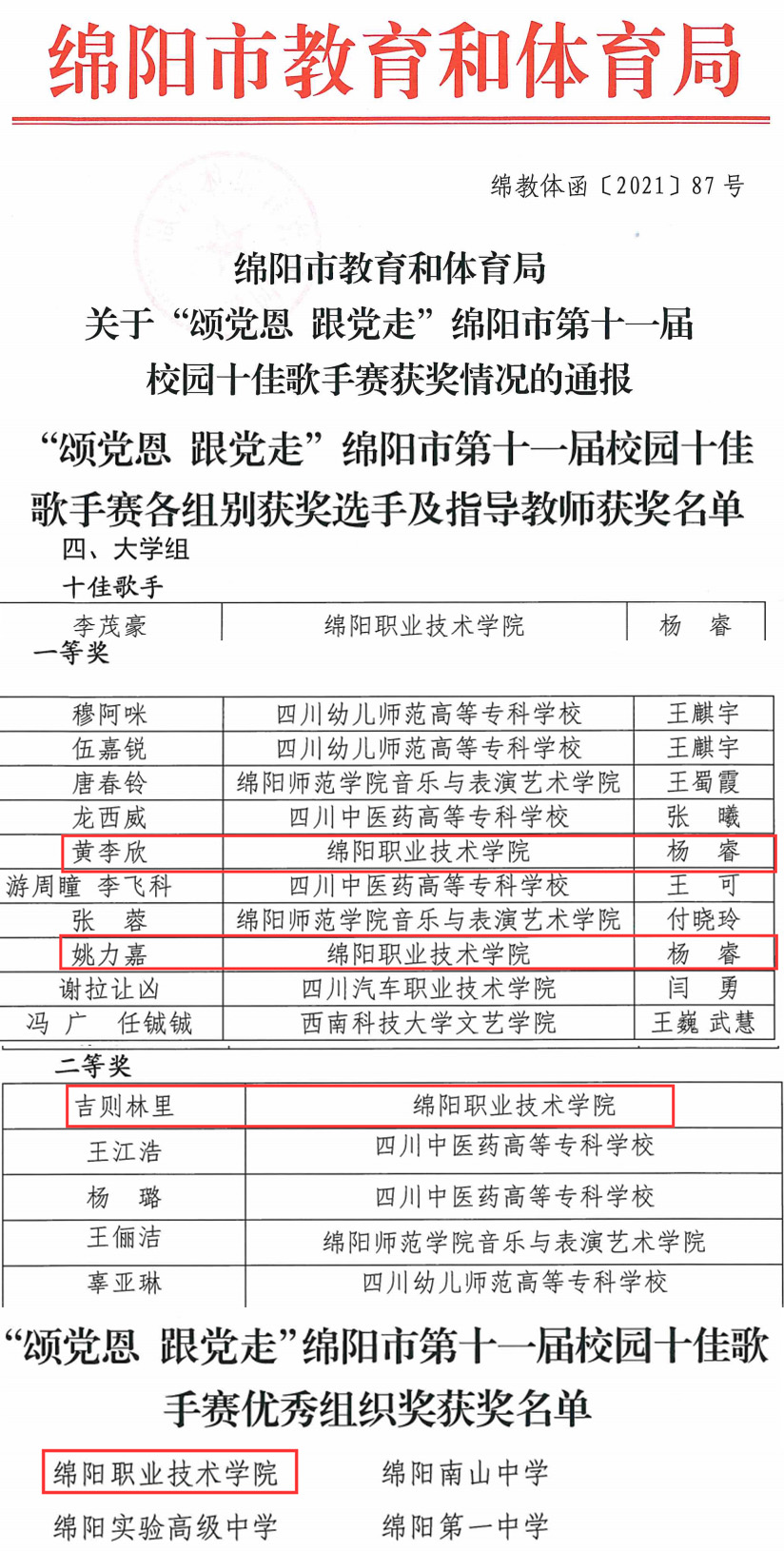 4月1日-2日,“颂党恩 跟党走”绵阳市第十一届校园十佳歌手赛在绵阳外国语学校顺利举行。我校学生李茂豪荣获“十佳歌手”称号,黄李欣、姚力嘉荣获一等奖,吉则林里荣获二等奖,杨睿为指导老师。同时,我校喜获“优秀组织奖”荣誉。