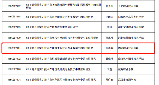 自2020年11月教育部行指委发布《关于组织做好职业教育改革创新课题申报工作的通知》以来,学校高度重视,积极组织教师申报。根据教育部行指委办公室函件(教行指委办函〔2021〕9号)文件,我校教师伍志强科研团队申报的《MR(混合现实)技术在建筑工程技术专业教学中的应用研究》(编号:HBKC217071)喜获立项,并获经费支持。这是学校在教育部行指委项目平台上的重大突破。