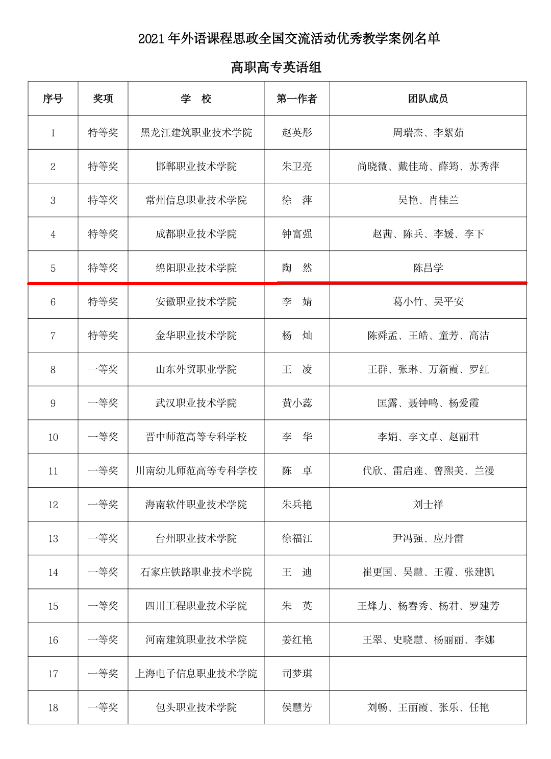 12月11日,我校公共教育学院陶然、陈昌学老师组成的团队在2021全国外语课程思政优秀教学案例比赛中获得全国特等奖。