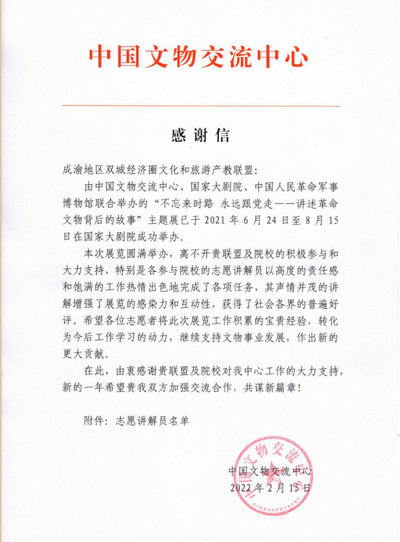 由中国文物交流中心、国家大剧院、中国人民革命军事博物馆联合举办的“不忘来时路 永远跟党走——讲述革命文物背后的故事”主题展已于2021年6月24日至8月15日在国家大剧院成功举办。我校旅游与管理学院学生林雪莹和乔英以志愿讲解员的身份参加了该主题展的讲解活动,并获通报感谢。