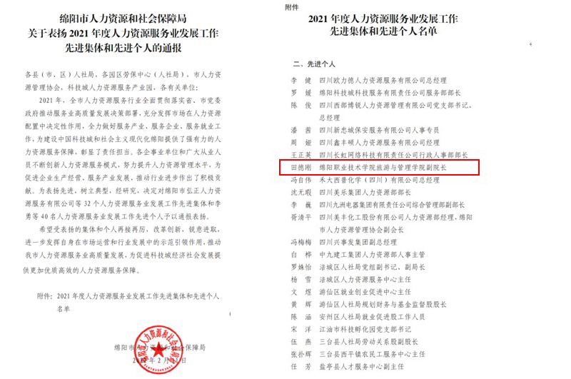 近日,绵阳市人力资源和社会保障局发布了《绵阳市人力资源和社会保障局关于表扬2021年度人力资源服务业发展工作先进集体和先进个人的通报》,我校教师田德刚被评为2021年度人力资源服务业发展工作先进个人。
