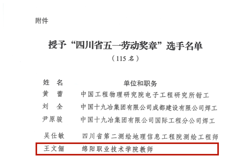 为扎实推进产业工人队伍建设改革,弘扬劳模精神、劳动精神、工匠精神,激励广大职工积极投身岗位练兵、技术比武活动,提升职业技能素质,提高职业技能水平,近日,四川省总工会决定对在第七届四川省职工职业技能大赛和2021年四川省职工职业技能比赛中的优秀选手进行表彰。我校旅游与管理学院教师王文俪荣膺“四川省五一劳动奖章”。
