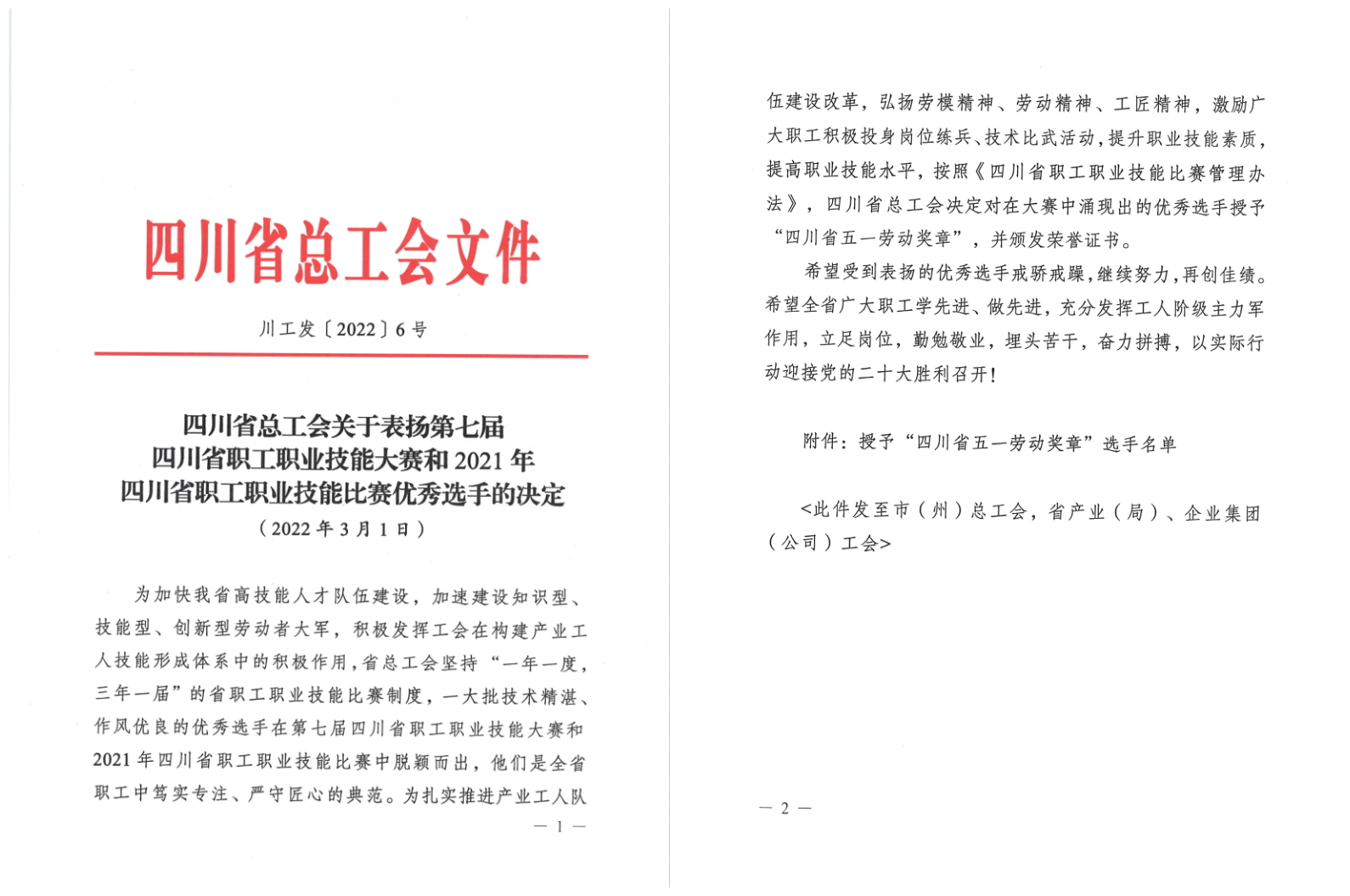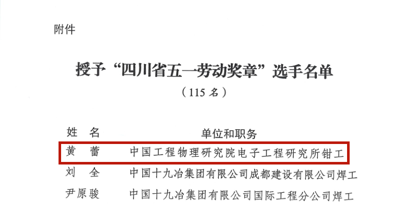 为扎实推进产业工人队伍建设改革,弘扬劳模精神、劳动精神、工匠精神,激励广大职工积极投身岗位练兵、技术比武活动,提升职业技能素质,提高职业技能水平,近日,四川省总工会决定对在第七届四川省职工职业技能大赛和2021年四川省职工职业技能比赛中的优秀选手进行表彰。我校优秀校友黄蕾荣膺“四川省五一劳动奖章”。