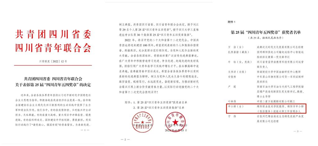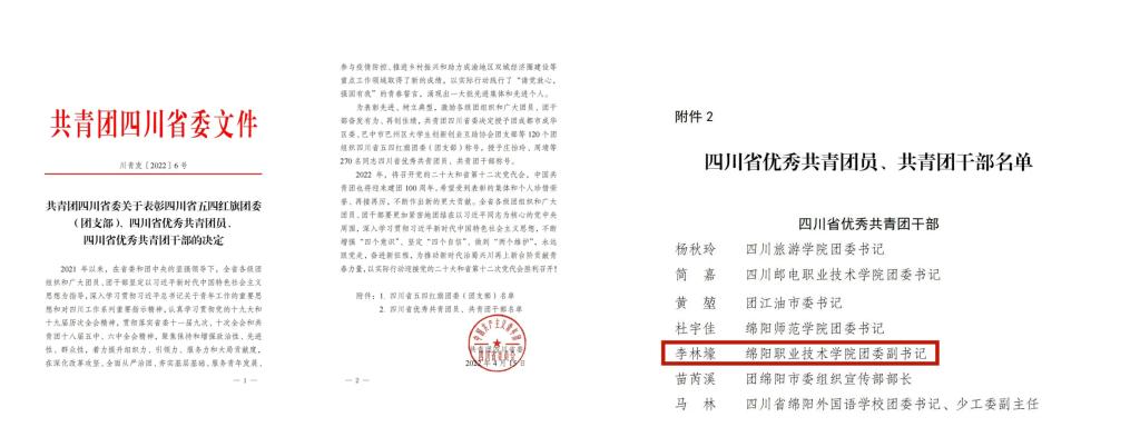 2021年以来,在省委和团中央的坚强领导下,全省各级团组织和广大团员、团干部坚定以习近平新时代中国特色社会主义思想为指导,深入学习贯彻习近平总书记关于青年工作的重要思想和对四川工作系列重要指示精神,认真学习贯彻党的十九大和十九届历次全会精神,贯彻落实省委十一届九次、十次全会和共青团十八届五中、六中全会精神,聚焦保持和增强政治性、先进性、群众性,着力提升组织力、引领力、服务力和大局贡献度,在深化改革攻坚、全面从严治团、夯实基层基础、服务青年发展、参与疫情防控、推进乡村振兴和助力成渝地区双城经济圈建设等重点工作领域取得了新的成绩。近日,共青团四川省委、四川省青年联合会决定对先进个人和集体进行表彰。我校教师申小婷荣膺第25届“四川青年五四奖章”;我校团委副书记李林壕荣膺“四川省优秀共青团干部”称号。
