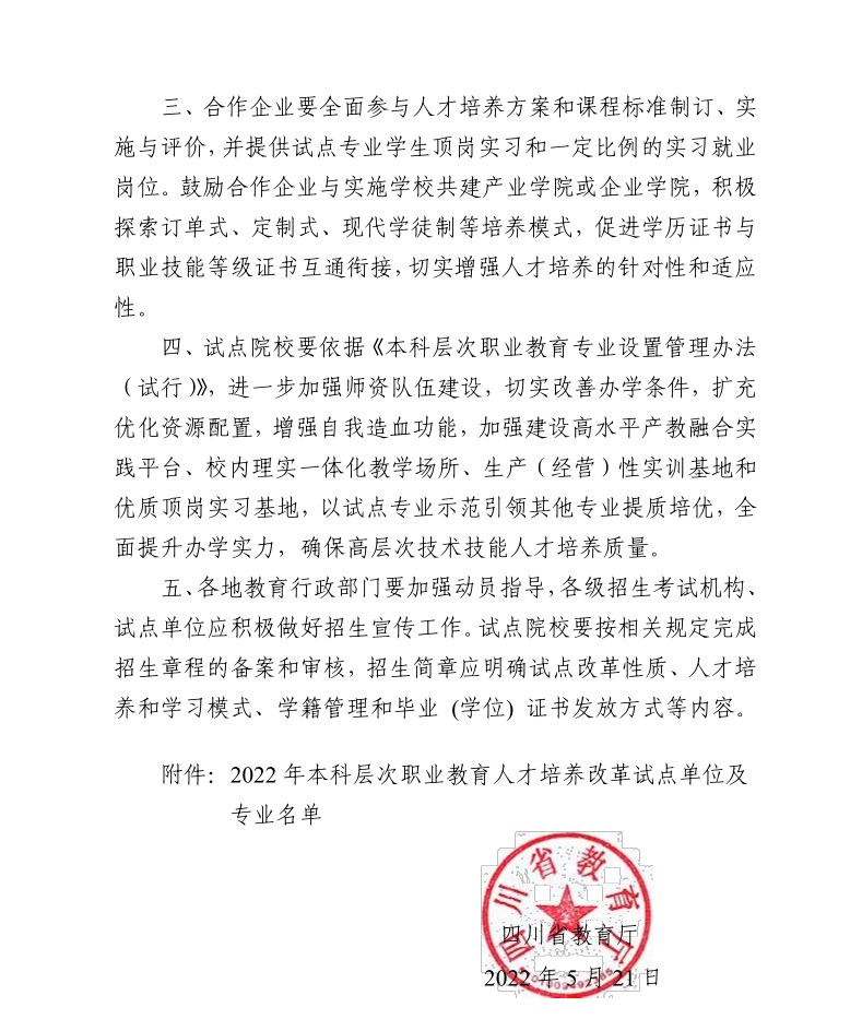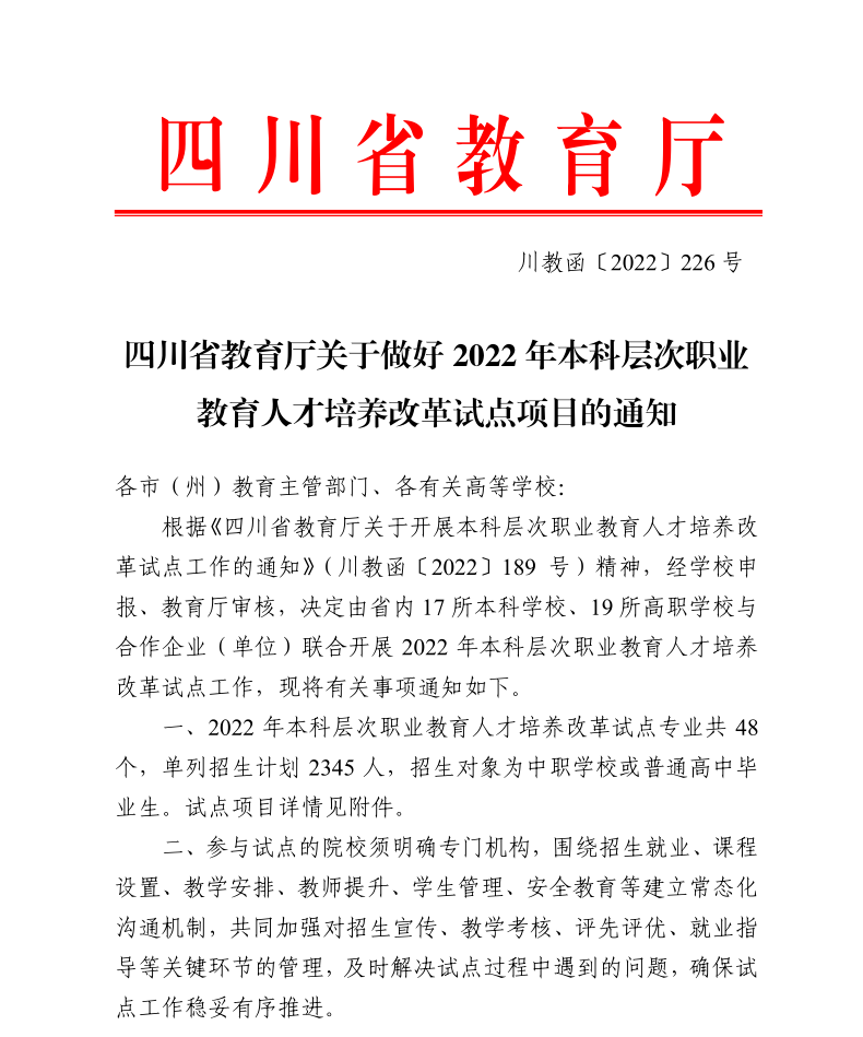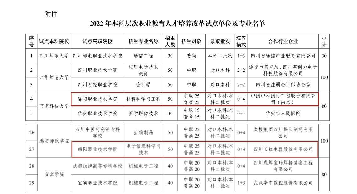 近日,根据《四川省教育厅关于做好2022年本科层次职业教育人才培养改革试点项目的通知》(川教函〔2022〕226号)精神,经学校申报、教育厅审核,决定由省内17所本科学校、19所高职学校与合作企业(单位)联合开展2022年本科层次职业教育人才培养改革试点工作。我校 “材料科学与工程”专业和“电子信息科学与技术”专业纳入“2022年本科层次职业教育人才培养改革试点项目”。这为我校建设区域性一流职业大学奠定了坚实的基础。