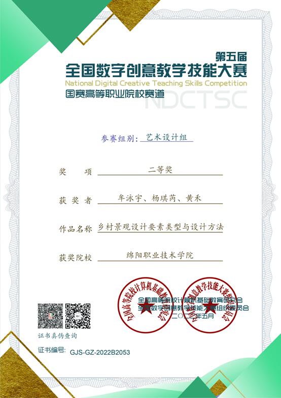 近日,由全国高等院校计算机基础教育研究会、全国数字创意教学技能大赛主办,中国电子视像行业协会数字影像创意委员会支持协办的第五届“全国数字创意教学技能大赛”落下帷幕。该比赛2021年成功入选教育部中国高等教育学会发布的《全国普通高校教师教学竞赛榜单》。本届大赛共有普通高校、高等职业院校3500余位教师的投稿参赛。我校艺术设计学院牟泳宇、杨琪芮、黄禾3位教师在众多参赛选手中脱颖而出,凭借作品《乡村景观设计要素类型与设计方法》获得高等职业院校赛道全国二等奖的优异成绩。