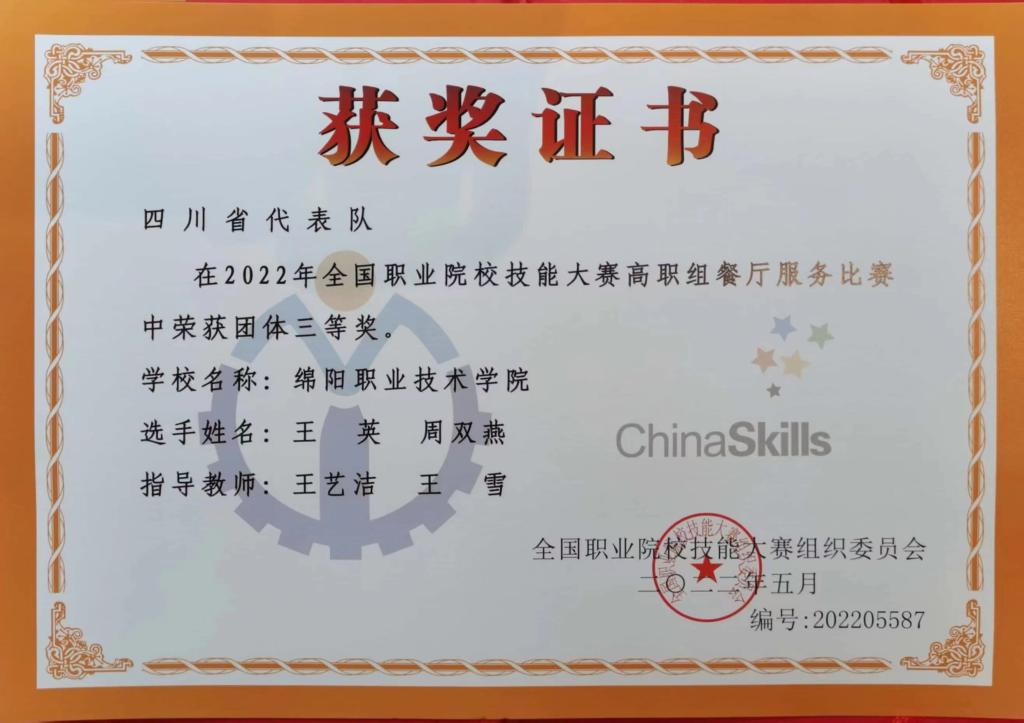8月26日—9月1日,2022年全国职业院校技能大赛(高职组)“餐厅服务”赛项在济南举行。由我校旅游与管理学院王艺洁、王雪两位老师指导,王英、周双燕两位同学组成的参赛团队代表四川省参加竞赛,与全国高水平的顶尖院校选手同台竞技,经过激烈角逐,荣获该赛项三等奖。