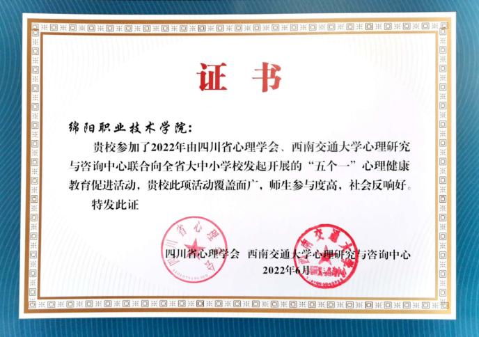 为贯彻落实《关于加强学生心理健康管理工作的通知》(教思政厅函〔2021〕10号)《四川省教育厅关于进一步加强高校心理健康教育工作的通知》(川教函〔2022〕214号)精神,牢固树立健康第一的教育理念,提升学生心理健康素养,四川省心理学会和西南交通大学向全省大中小学发起开展“五个一”心理健康促进行动倡议。我校积极响应,同省内各院校共同携手构建全省学校心理健康保障体系,助力学生的健康成长,活动成果突出,获得省级表彰。