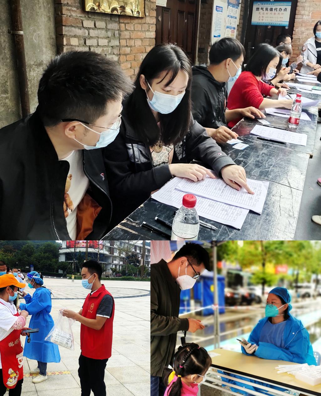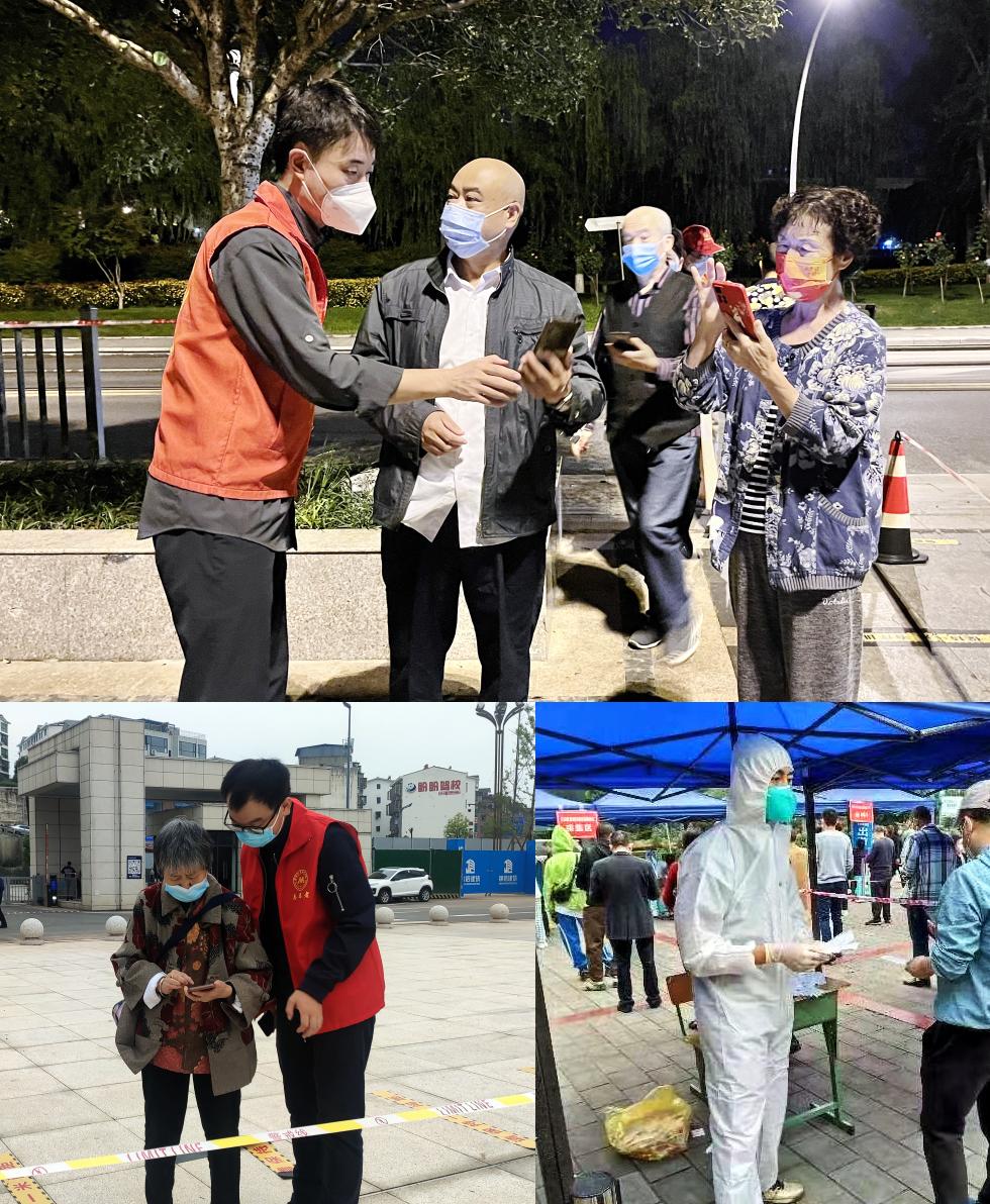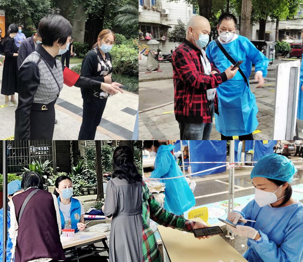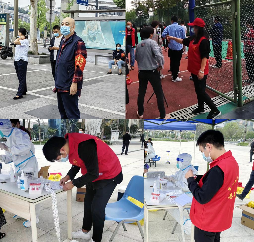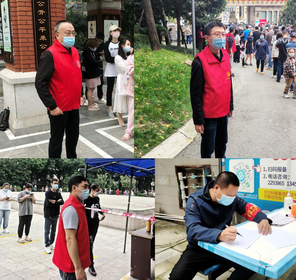 机关二党总支贾国均、彭文、刘浏、周永斌等在沈家坝等社区协助工作人员进行核酸检测信息登记和秩序维护等工作。“抗疫有我,风雨共担,凝心聚力,共克时艰,为疫情防控贡献自己的一份力量!”