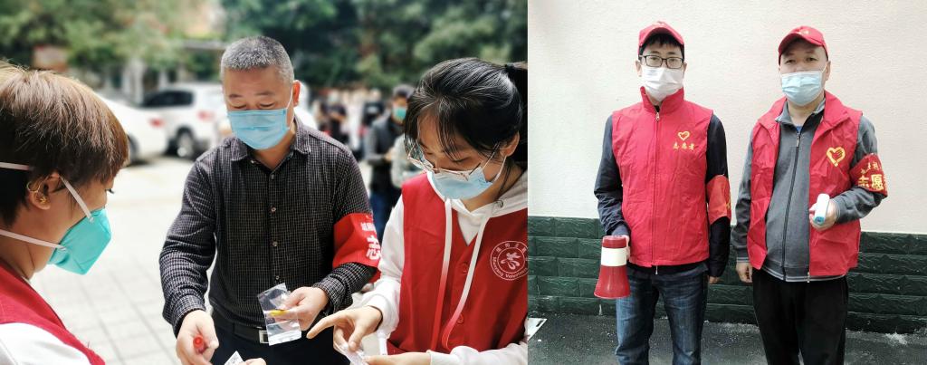 材料与建造学院党总支邓峥嵘、孙会宁、高峰、杨浩等教师在博大紫金广场、海赋长兴、汉仙桥社区等地踊跃参加志愿活动。他们协助医护及社区工作人员粘贴采样管条形码,维护现场秩序等,尽自己所能,服务大家。“绵阳是我们共同的家园,爱绵阳,爱家园,不只是平日里口头上的表达,更重要是关键时刻行动上的体现。”