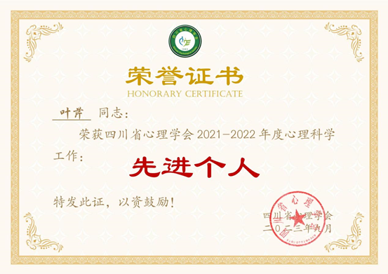 2023年9月,四川省心理学会发布了《关于2021-2022年度心理科学工作先进个人和先进集体评选结果的公示》(心理学会〔2023〕186号)。经过单位和个人积极申报,资格初审、通讯评审和会议评审等环节,我校从近200个申请机构中脱颖而出,获得四川省心理学会2021-2022年度心理科学工作先进集体。我校心理健康教育与咨询中心主任叶芹获得2021-2022年度心理科学工作先进个人。