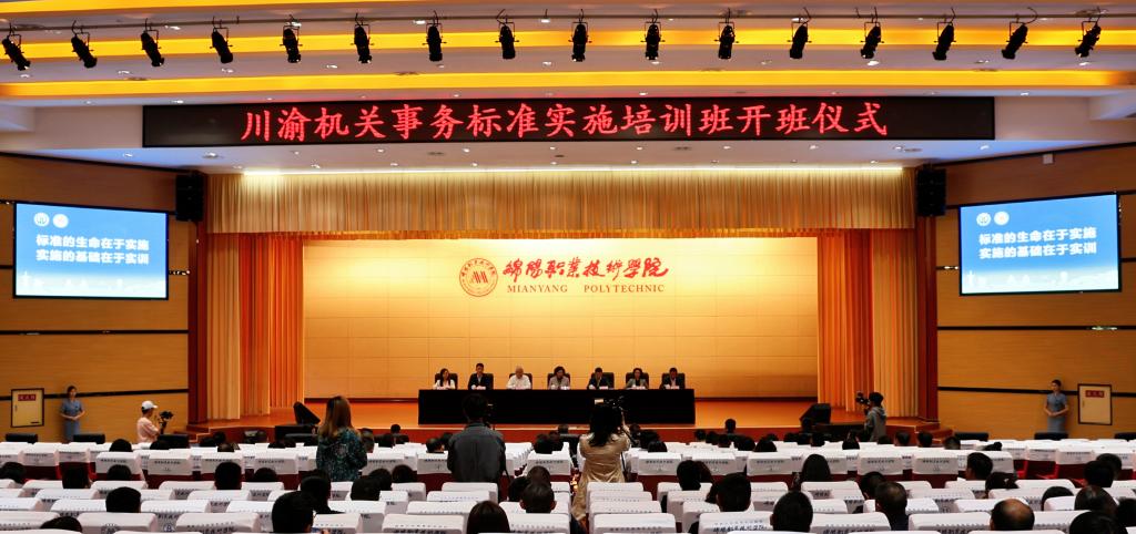 10月16日上午,川渝机关事务标准实施培训班开班仪式在我校举行。省机关事务管理局党组成员、副局长、机关党委书记张肃,重庆市机关事务管理局党组成员、副局长张家强,绵阳市委常委、副市长吴昊,我校党委书记袁蓉出席开班仪式。张家强主持开班仪式。