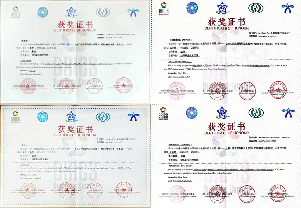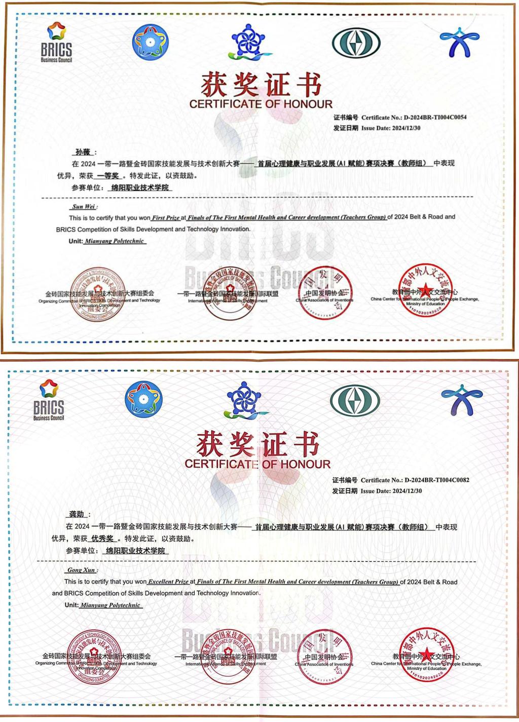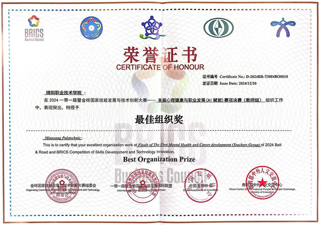 12月26至30日,2024“一带一路”暨金砖国家技能发展与技术创新大赛首届心理健康与职业发展(AI赋能)赛项决赛在四川乐山举办,来自全国33所职业院校百余名师生同台竞技。经过激烈角逐,我校智能制造学院教师孙薇、学生工作部心理中心教师龚勋分别荣获教师组一等奖和优秀奖,智能制造学院数控231班陈俊文荣获国内学生组三等奖、材料与建造学院材料本科2301全佳一荣获优秀奖;旅游管理学院黄梓茼荣获国际学生组三等奖,王沐辰荣获优秀奖。学校荣获最佳组织奖。
