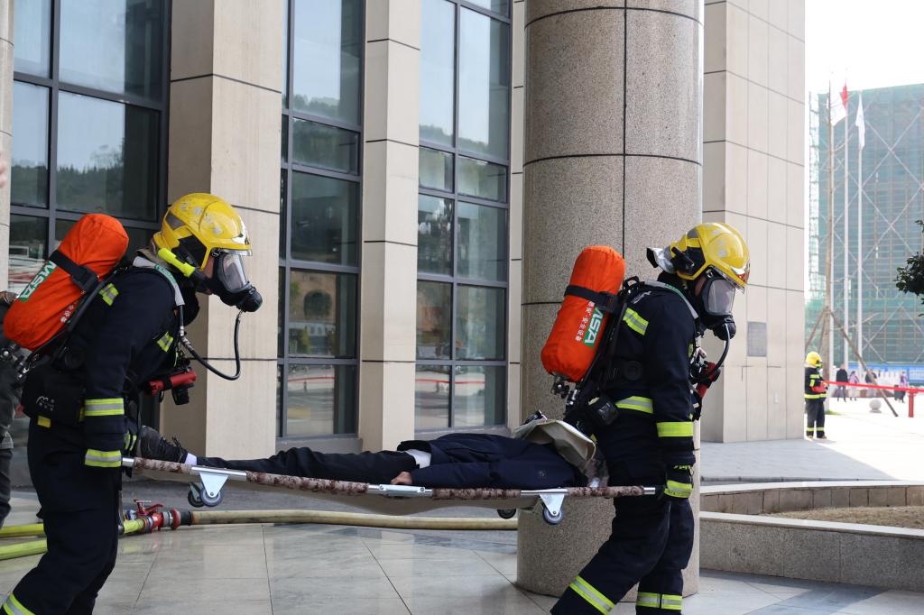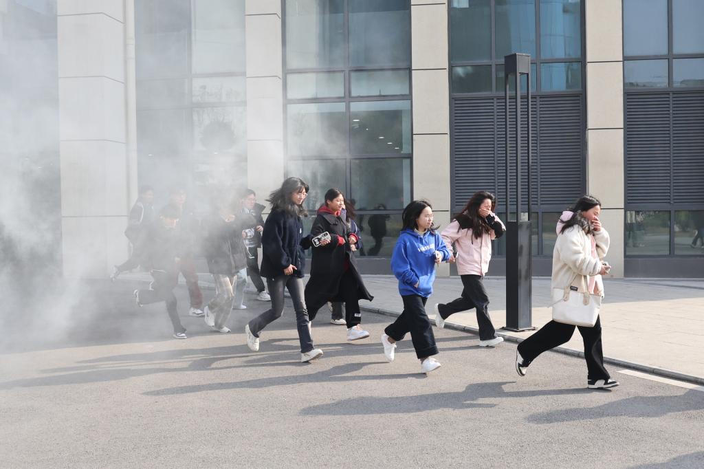 随着演练指令下达,校园瞬间拉响警报。教学楼内师生迅速响应,按照预定疏散路线,弯腰低姿、用手捂住口鼻,快速有序地向安全区域撤离。疏散全程有条不紊,未出现拥挤、踩踏等次生风险,充分展现出师生良好的应急素养;保卫、后勤等部门反应迅速、联动出击,消防通道畅通无阻,应急照明设备正常启用;医疗救护组迅速就位,模拟伤员救治流程规范,体现了部门协同作战能力。
