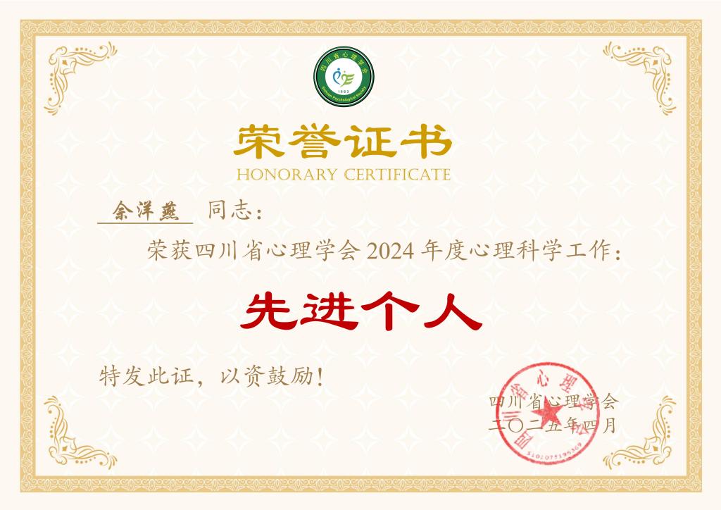 近日,四川省心理学会公布了2024年度心理科学工作先进集体和先进个人评选结果。我校心理健康教育与咨询中心荣获先进集体称号,党委学生工作部副部长、心理中心主任佘洋燕荣获先进个人称号。