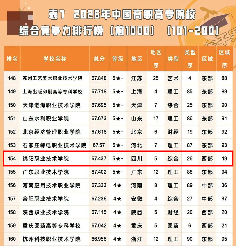 时序更替,逐梦前行。2026年是“十五五”开局之年,更是我校“升本达标”攻坚突破的关键之年,站在新的历史起点上,全体绵职人将以此排名跃升为新契机,不骄不躁、再接再厉。未来,学校将持续坚守实干初心,锚定战略目标,深化教育教学改革,强化职教特色办学,以更高站位对接国家战略,以更宽视野对标国省先进,以更实举措破解发展难题,锤炼过硬本领、勇于担当作为,推动学校办学水平再上新台阶,加快实现高质量发展,为教育强省、教育强市建设注入强劲绵职力量,奋力培养更多高素质技术技能人才、能工巧匠、大国工匠。