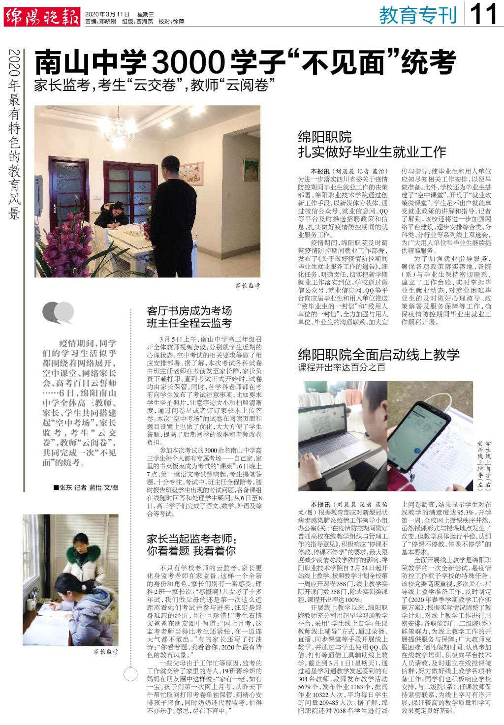凤凰新闻网、四川职教网、绵阳晚报:绵阳职院全面启动线上教学一周教学秩序井然