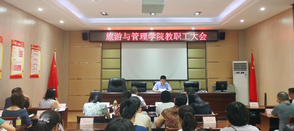 7月19日,旅游与管理学院举行教职工大会,党总支书记苟安经、副院长肖昆、党总支副书记杜鹏、副院长田德刚出席会议。全院教职工参会。