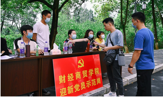 “一个党员示范岗就是一面旗帜”,2021年9月4日,财经商贸学院的迎新工作正式开始。由尹诗、巩固、马辞森老师及学生党员代表组成了“党员示范岗”先锋阵地,党员干部在阵地上亮身份、担使命、履职责、甘奉献,充分发挥共产党员的先锋模范作用,为迎新工作有序进行提供重要保障。