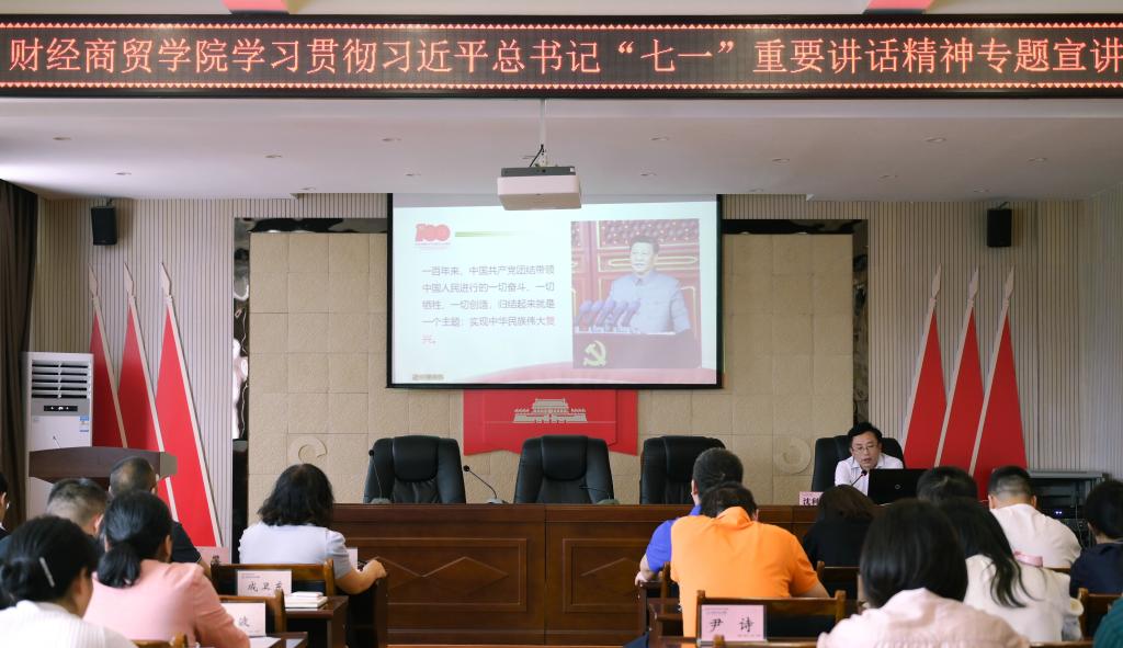 9月22日下午,财经商贸学院在崇实楼三楼会议室举行学习贯彻习近平总书记“七一”重要讲话精神专题宣讲会。校党委常委、纪委书记沈利剑作专题宣讲。党总支书记苏自强主持会议,全体教职工参加会议。