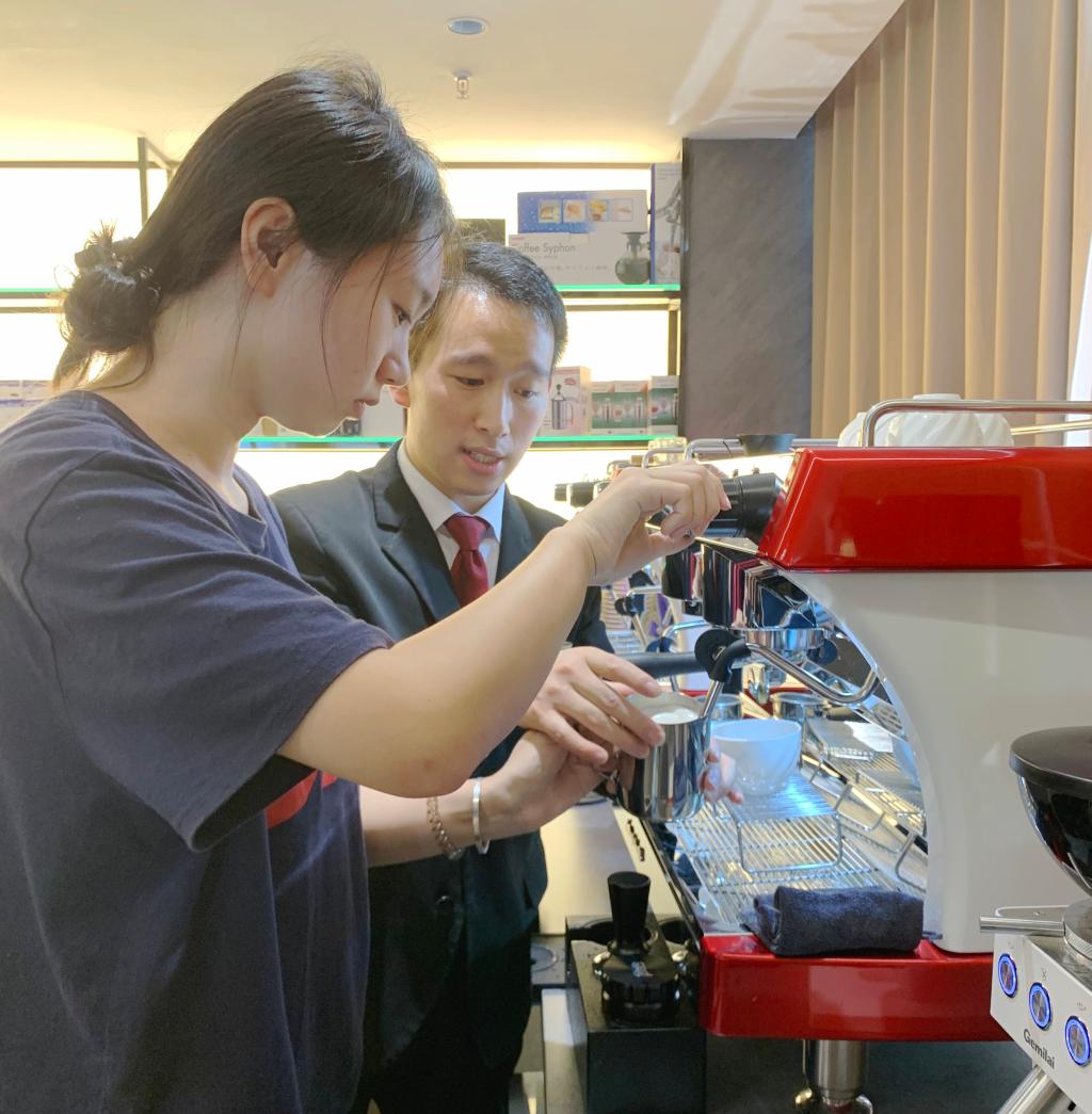 课上,沙库拉林向同学们讲解了调酒的基本流程和制作方式,强调了精准的量取和熟练的摇酒技巧,让同学们在实际操作中学习制作经典鸡尾酒的方法,感受经典鸡尾酒调配方法的不同和风味的区别,加强了同学们对于调酒技巧的学习和掌握。在咖啡制作培训中,沙库拉林指导同学要根据豆子的风味调节水温水量,融合自己的创意进行萃取,得到一杯令顾客满意的咖啡。