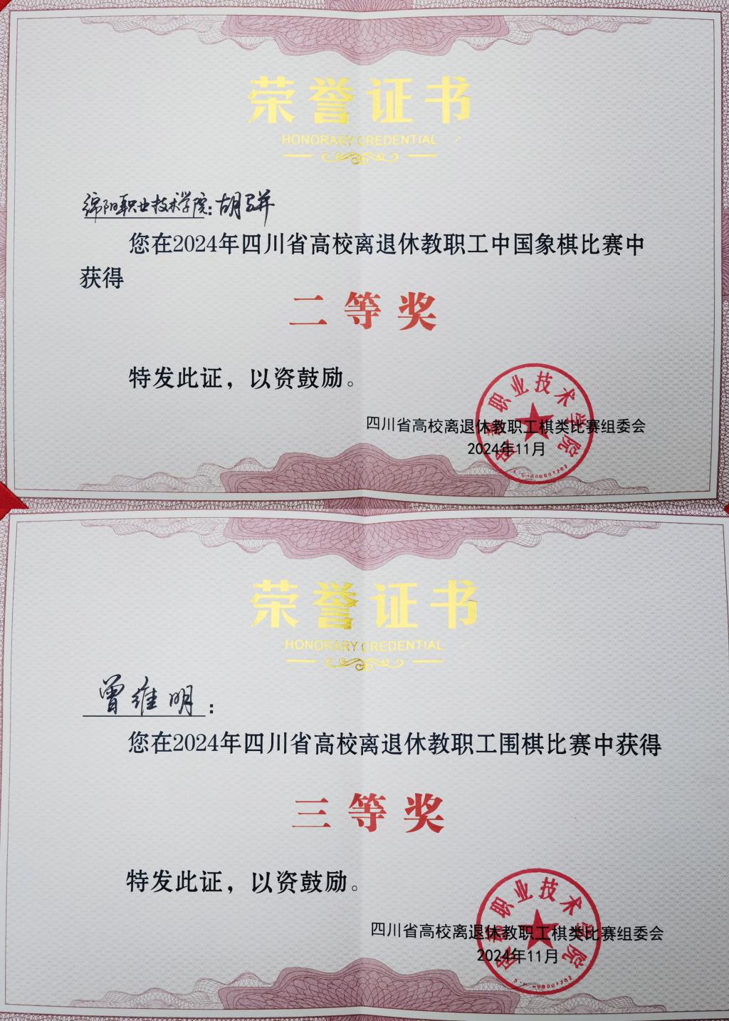 11月12日至13日,2024年四川省高校离退休教职工棋类比赛在成都职业技术学院高新校区棋艺学院举行,学校选派胡骈、田小平、黄泽森、曾维明4名退休教职工参加比赛。
