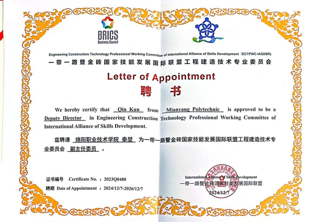 12月7日,“一带一路”暨金砖国家技能发展国际联盟工程建造技术专业委员会年度会议在浙江召开,我校入选“一带一路”暨金砖国家技能发展国际联盟工程建造技术专业委员会副主任委员单位名单,材料与建造学院建筑工程技术专业带头人、教研室主任秦堃被聘为“一带一路”暨金砖国家技能发展国际联盟工程建造技术专业委员会副主任委员。