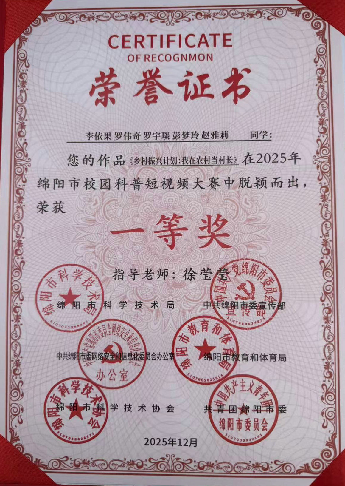 近日,绵阳市校园科普短视频大赛颁奖仪式在绵阳市新闻传媒中心举行。经过多轮激烈角逐,我校人工智能学院学生李依果、罗伟奇、罗宇琰、彭梦玲、赵雅莉的作品《乡村振兴计划:我在乡村当村长》(指导教师:徐莹莹)和人工智能学院学生罗宇琰、李依果、罗伟奇的作品《机械狗——火场救援中的科技“尖兵”》(指导教师:林宇)脱颖而出,均获得一等奖。