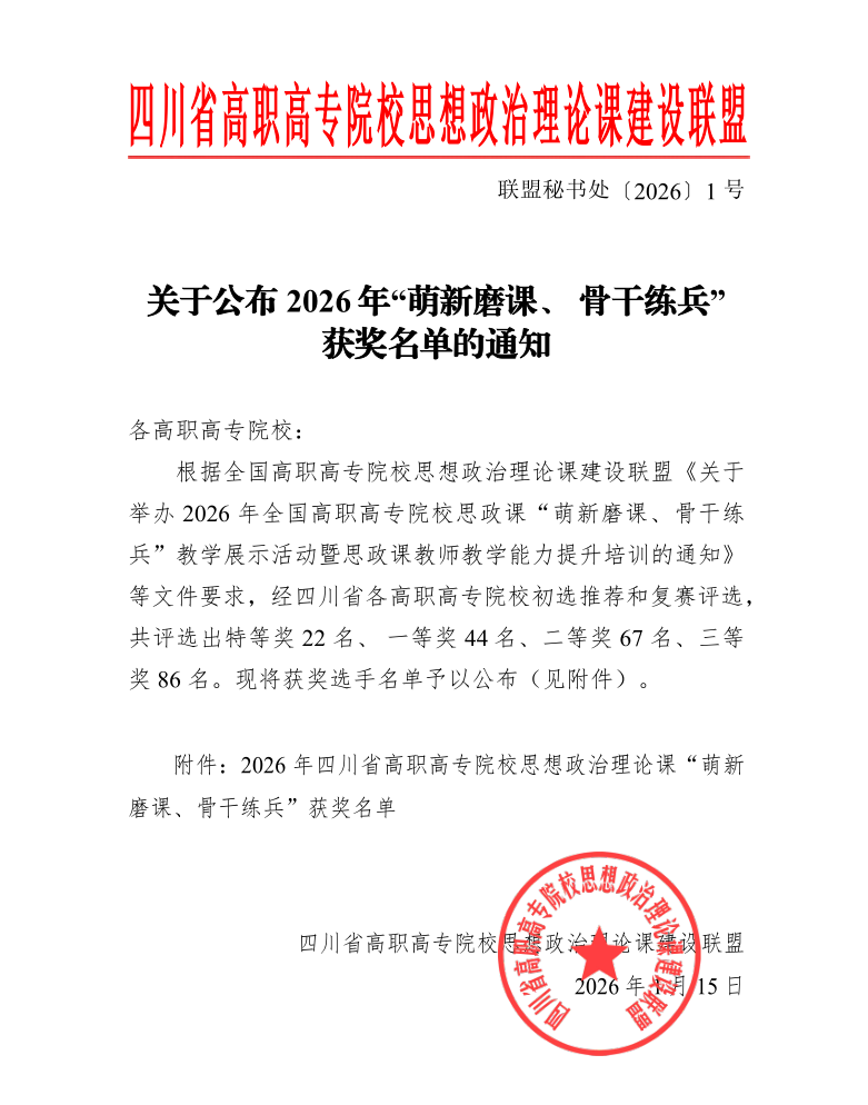 近日,四川省高职高专院校思想政治理论课建设联盟公布了2026年“萌新磨课、骨干练兵”教学展示活动获奖名单。我校多位思政课教师在不同赛项、不同课程组别中表现突出,荣获多项荣誉。
