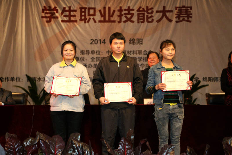 中职水泥物检项目二等奖获得者:广东省理工职业技术学校李文涛,绵阳工业技师学院李欢,山东工程技师学院蒋凯丽
