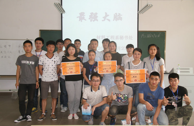 5月27日下午,材料工程系秘书处在崇实楼204室举行“最强大脑”知识竞赛。全系2014级各班学生组队参赛,比赛共分为三个环节:必答题、抢答题和趣味问答题。经过紧张而激烈的角逐,最终,玻璃141班战胜群雄,勇夺冠军;化工141班荣获二等奖;陶瓷141班获得三等奖;罗静同学获得“优秀个人奖”。