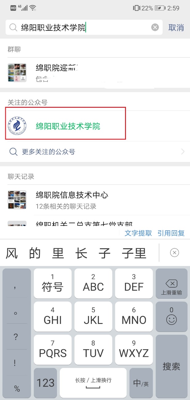 2、在上方的搜索栏中输入“绵阳职业技术学院”,选择公众号,进行搜索